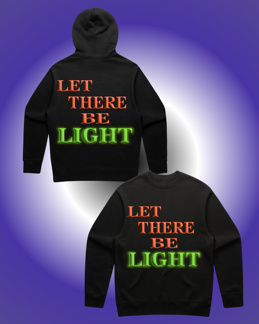 Stand out in our exclusive "LET THERE BE LIGHT" hoodie and crewneck. Our luminous design is bound to turns heads this season.